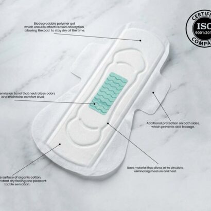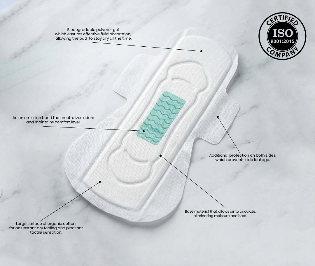 The surface of these pads is made of soft organic cotton, which feels nice and gentle on the skin. The high-absorbent, biodegradable polymer gel core quickly locks in menstrual flow and keeps the pad dry for longer. The breathable base material helps prevent moisture build-up. Extra side protection helps avoid leaks during movement and everyday activities. The anion emission band technology eliminates odours and keeps you feeling fresh and clean all day long.